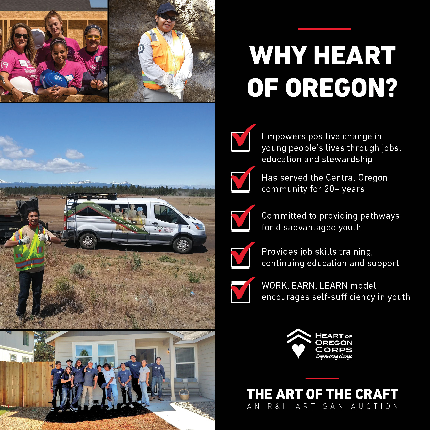 Our R&H Artisans were asked to select which nonprofit organizations would be the beneficiaries of our event, within R&H’s three community service pillars of youth, food security and the environment. We received an overwhelming vote for Girls Build in Portland, and Heart of Oregon in Bend. Both of these organizations have a proven track record of enriching the lives of young people through trades education. The images below provide a breakdown of the amazing things each of these nonprofits do for our community.