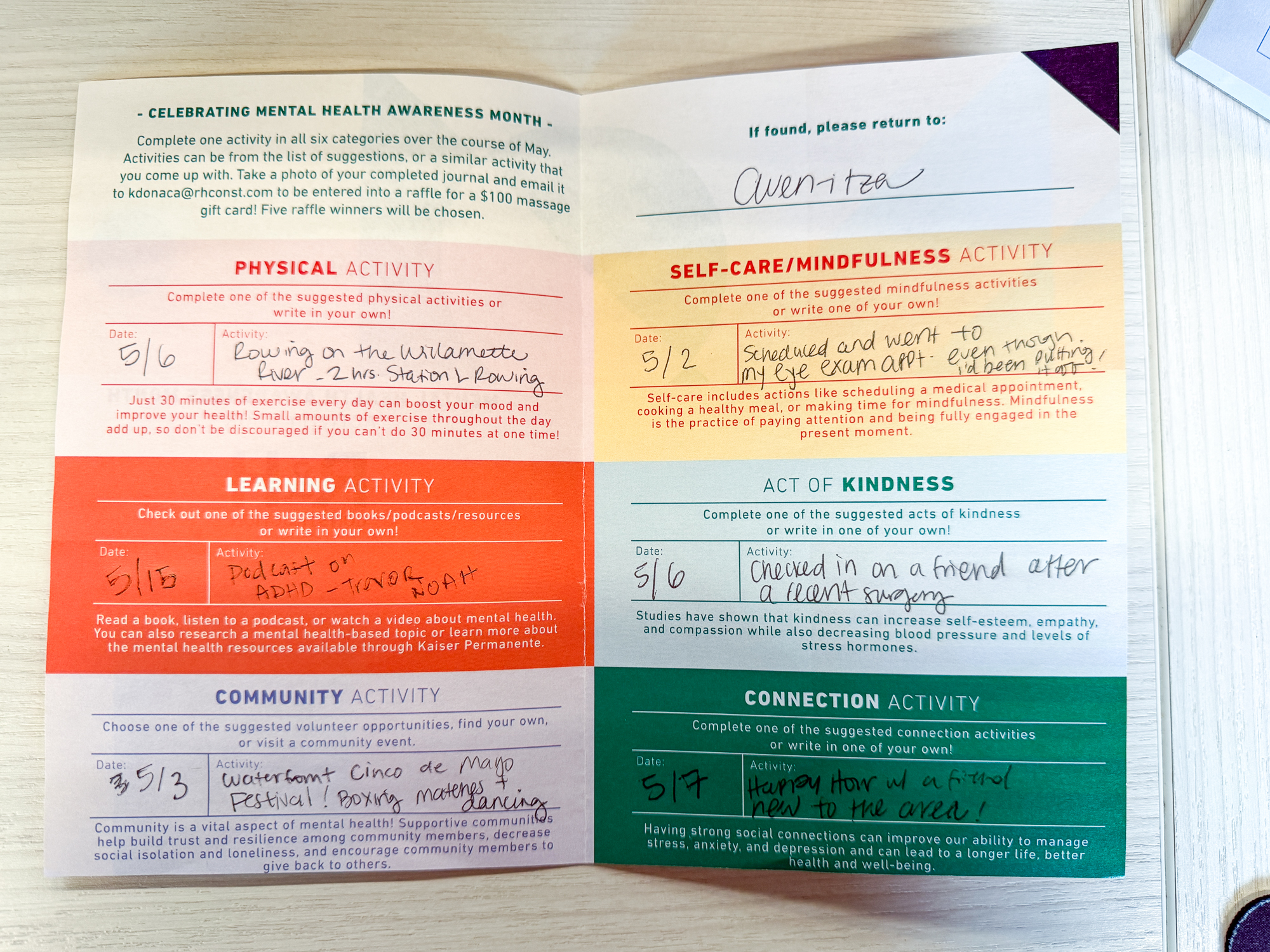 The colorful Mental Health Awareness Month Activity Books encouraged team members to complete a range of wellness activities in different categories from Acts of Kindness to Self-Care and Physical Movement for a chance to win a prize.