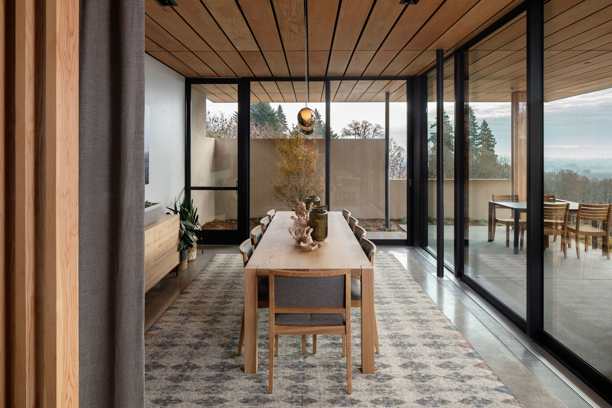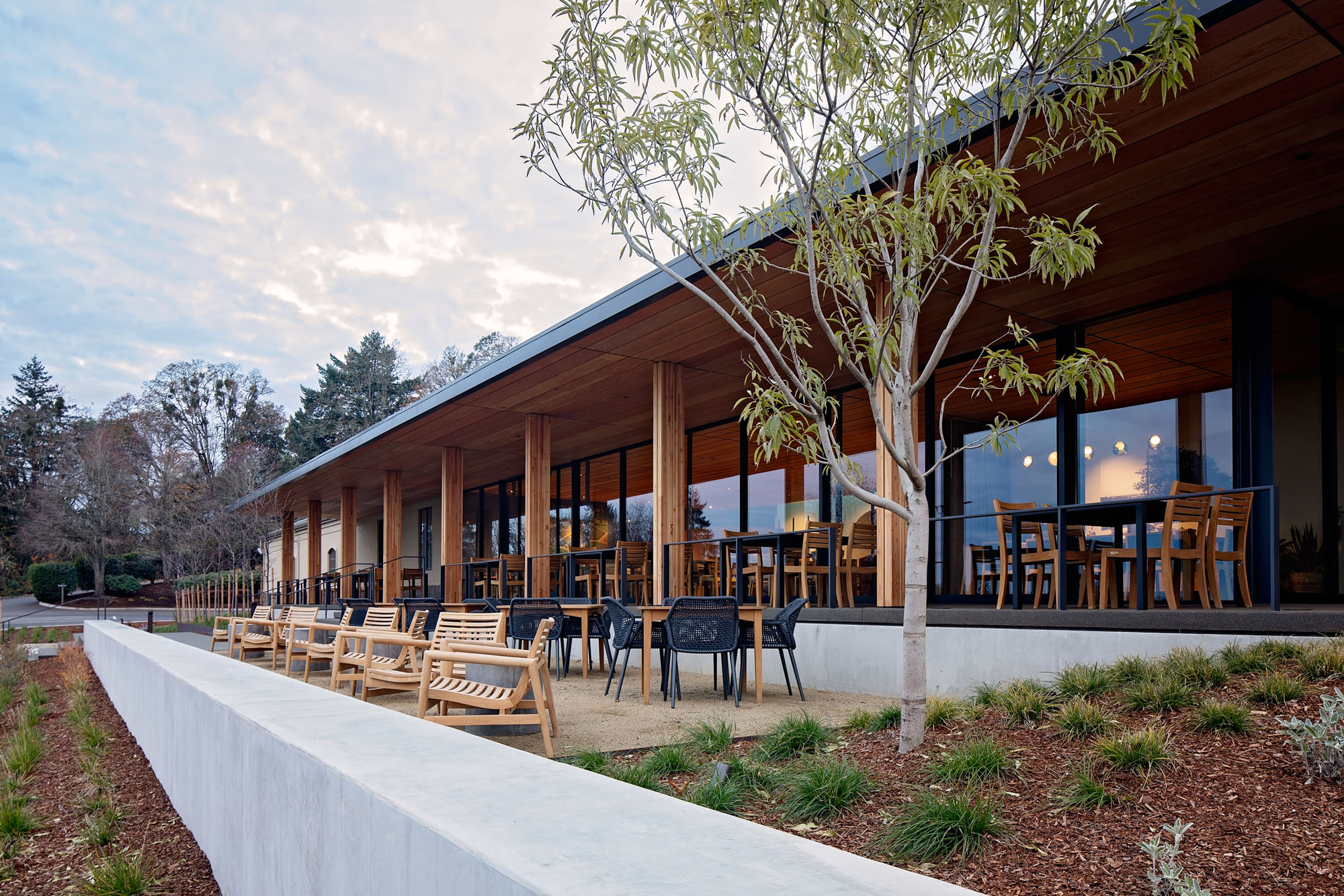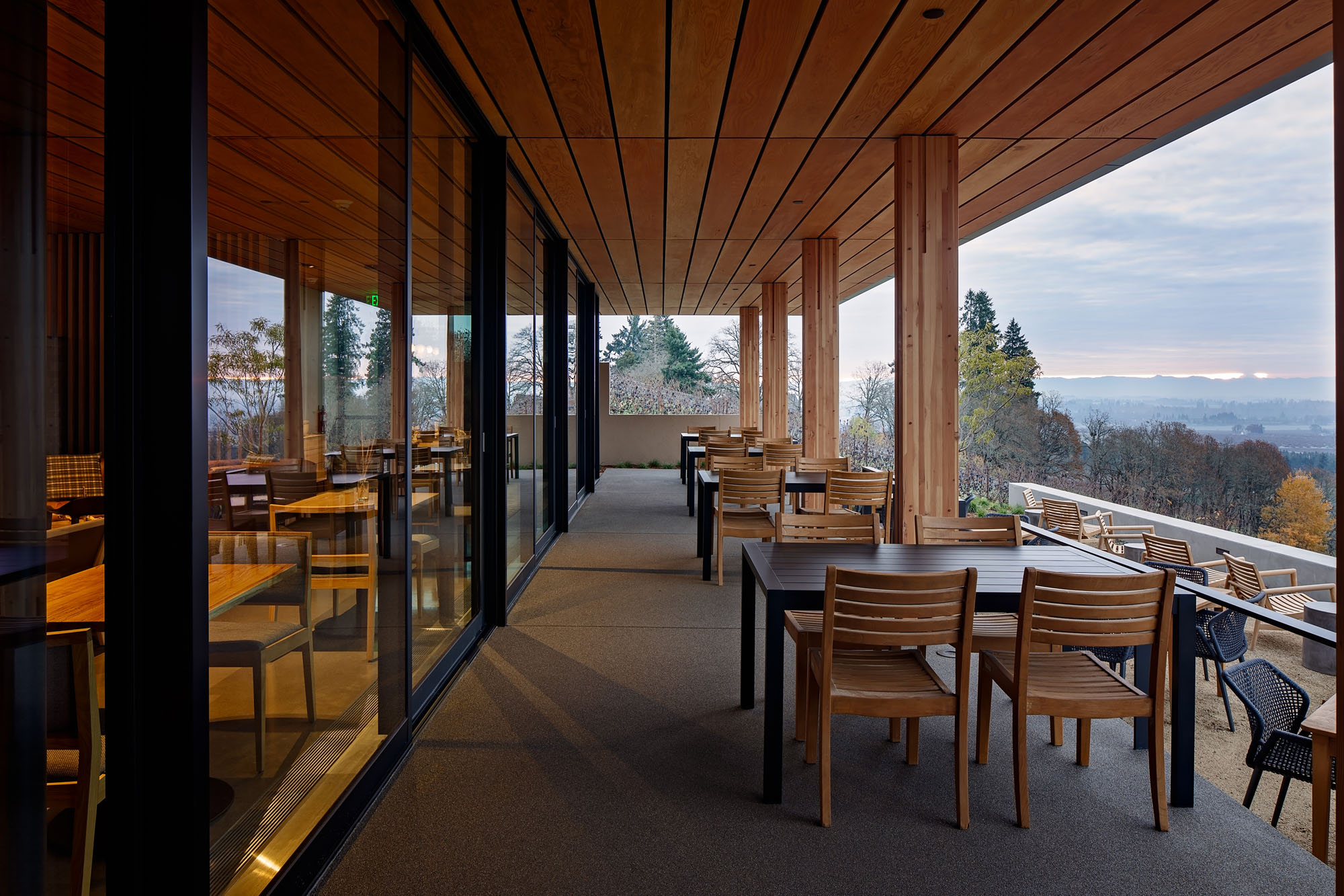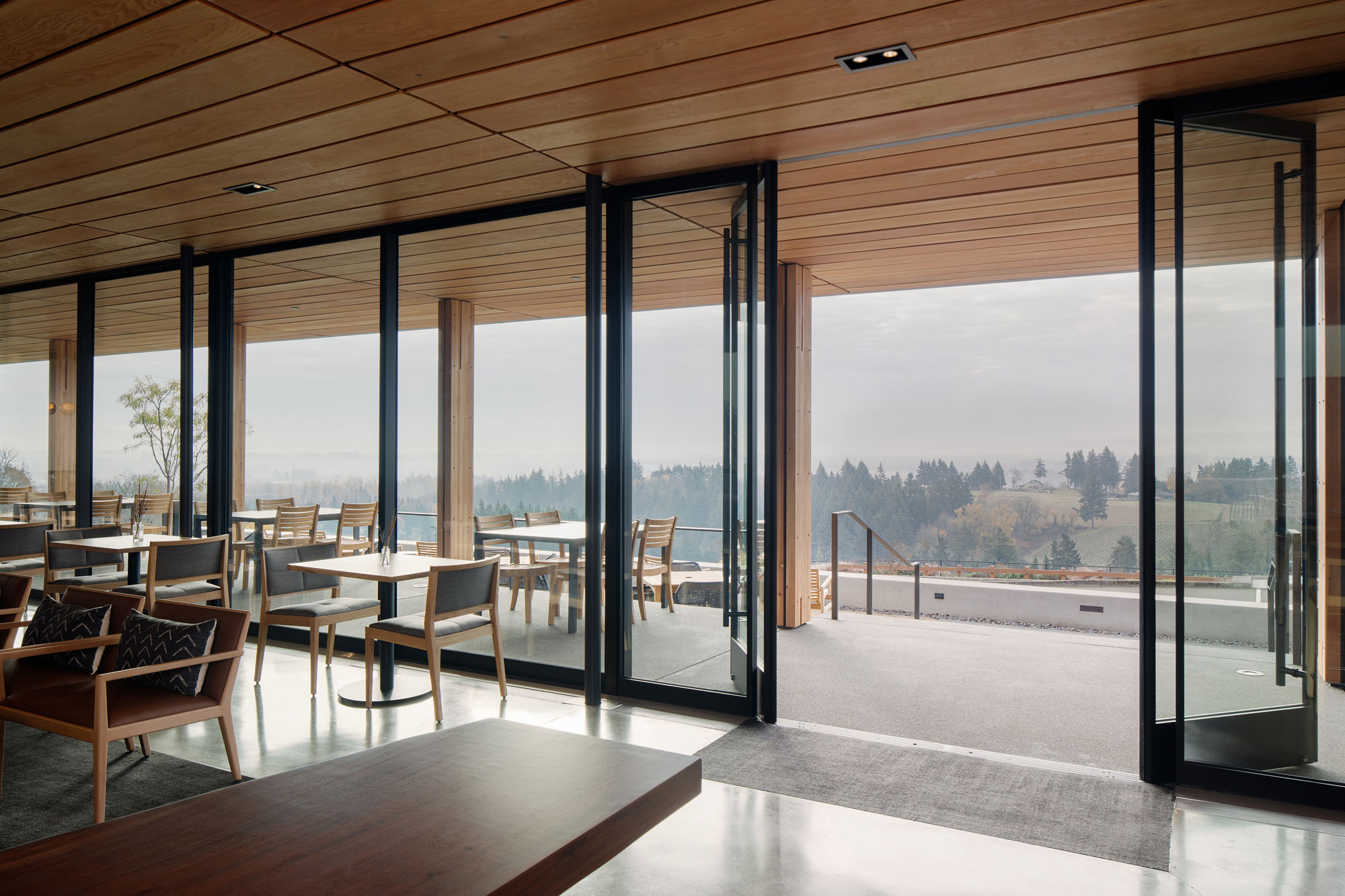 Archery Summit’s new tasting room, called the Tasting House by the winery, was designed to carefully stitch into existing facilities. The jewelry-box like Tasting House sits atop an existing outdoor patio and garden space, which served as an entry point for the caves and the beginning of Archery’s tasting experience. The cave’s original entrance remains but now serves as a focal point inside the Tasting House. Three sides of the new Tasting House were existing – the winery on the west side of the building and retaining walls on the north and east side of the building. While this greatly reduced required envelope construction, the existing structure required foundation structure, waterproofing, cladding and other improvements to serve the needs of the new Tasting House. The new southern façade was constructed of a glass storefront system while a 100’ long colonnade stitches old and new together into a larger composition while providing much needed shade and outdoor seating. Deep overhangs eliminate direct solar heat gain in summer, while allowing direct winter sun to passively heat the space. The terrace offers panoramic views across the Dundee hills to the south, with large sliding glass panels providing a seamless indoor/outdoor connection.