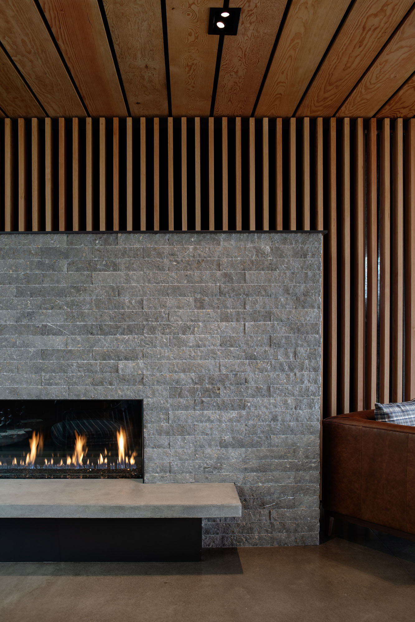 Archery Summit’s custom wood ceiling is one of the tasting room’s most striking features. The wood flows seamlessly from the interior of the tasting room to the exterior patio, beautifully uniting the two spaces. The ceiling has a removeable clip system, allowing the Archery Summit facilities team or tradesworkers to easily access junction boxes, electrical and low voltage while also maintaining a clean visual for guests. Each of the roughly 273 wood boards was custom cut allowing for the one inch reveals between each board and alignment with all adjacent finishes creating symmetry throughout the space.