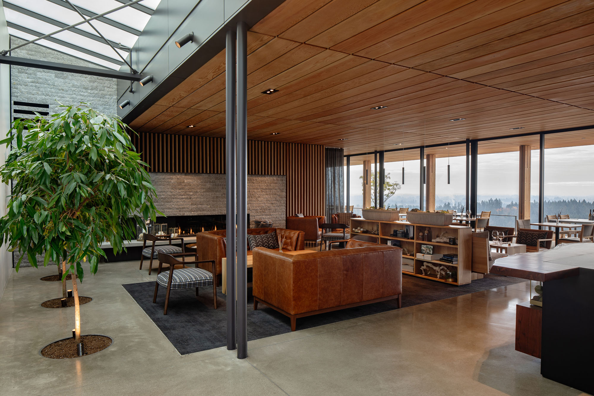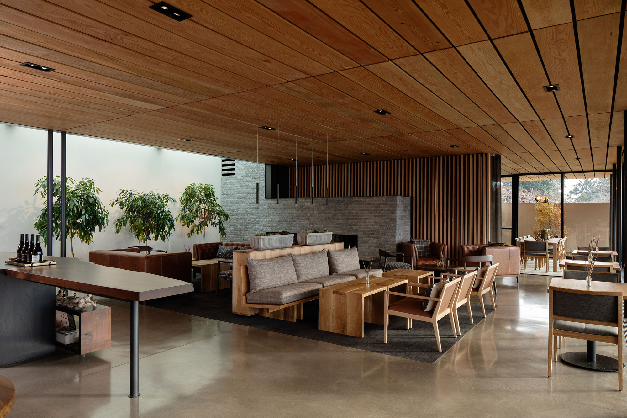 The Archery Summit Tasting House utilized two unique systems, the Blue Duct underground mechanical system and a custom wood ceiling, which helped to create a clean and cohesive guest experience while maintaining functionality.