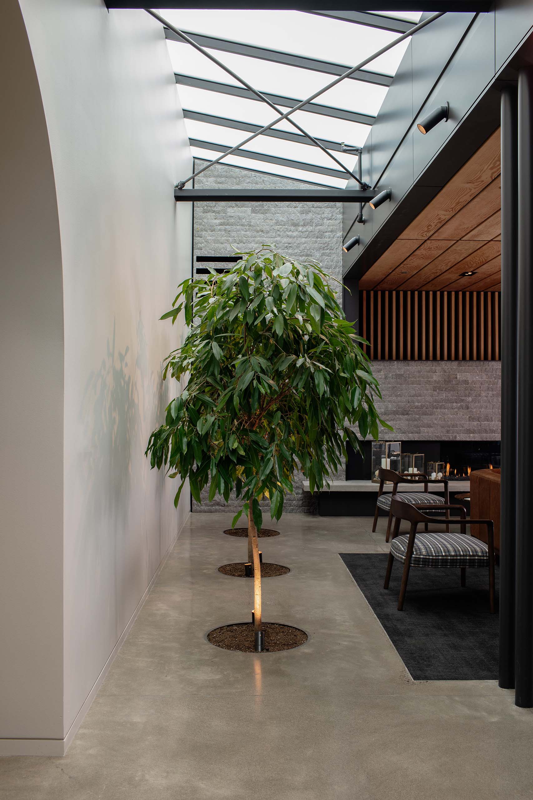 Inside the structure is a beautiful yet inviting space that creates a lively atmosphere. The 2,600 s.f. room triples Archery Summit’s previous tasting space, giving them the ability to entertain more guests as well as create a luxury tasting experience through carefully-constructed details such as a fireplace and custom skylight. The continuous 42’ skylight, which is situated above the north side of the building opposite the colonnade, washes the wall with light, balancing light within the space, while trees planted inside below the skylight serve to connect inside with outside in a meaningful way. A tiled fireplace brings warmth and light into the space, creating year-round ambiance that is especially beneficial during Oregon’s long rainy season. On the east side of the Tasting House is a separate space, able to be closed-off from the remaining tasting room. This space allows Archery Summit to better entertain VIP guests, such as wine critics and club members, in a way that allows for privacy and more in-depth conversation. Beyond private space, the Tasting House has a variety of seating options for groups of all sizes. The tasting room is situated around the cave entrance, as intended. The existing wood doors were replaced with custom glass doors which welcome the ambiance of the caves into the tasting room, uniting these two unique experiences.