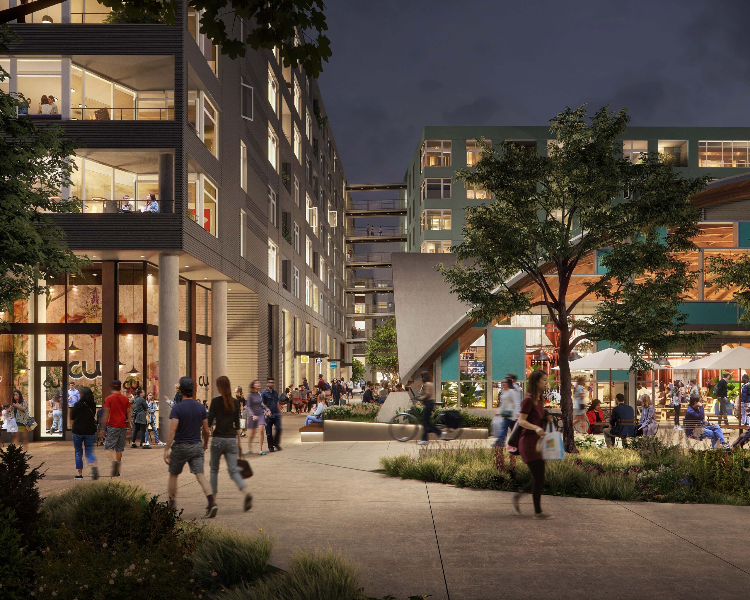 Located in Slabtown, this seven-story mixed-use building will offer 192 residential units in addition to commercial space and underground parking. A second-story pedestrian bridge connects the main building to a two-story pavilion offering resident amenities such as a fitness center, club room, outdoor terrace and maker’s lab.
