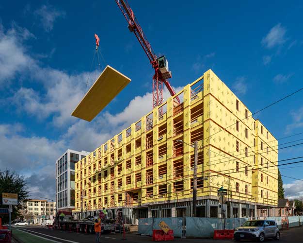 It’s durable: CLT is produced by gluing together solid-sawn lumber in perpendicular layers to create sturdy, stable panels up to a foot thick. CLT is also one of the most seismically resilient building materials available which is an important factor for buildings in the Pacific Northwest. The joints between CLT boards allow buildings to dissipate energy efficiently, minimizing structural damage during an earthquake. Because of the thickness associated with large structural wood elements, mass timber is naturally fire resistant. When burned, the charred layer on the outside creates a protective seal, preventing the inner layers of wood from burning.