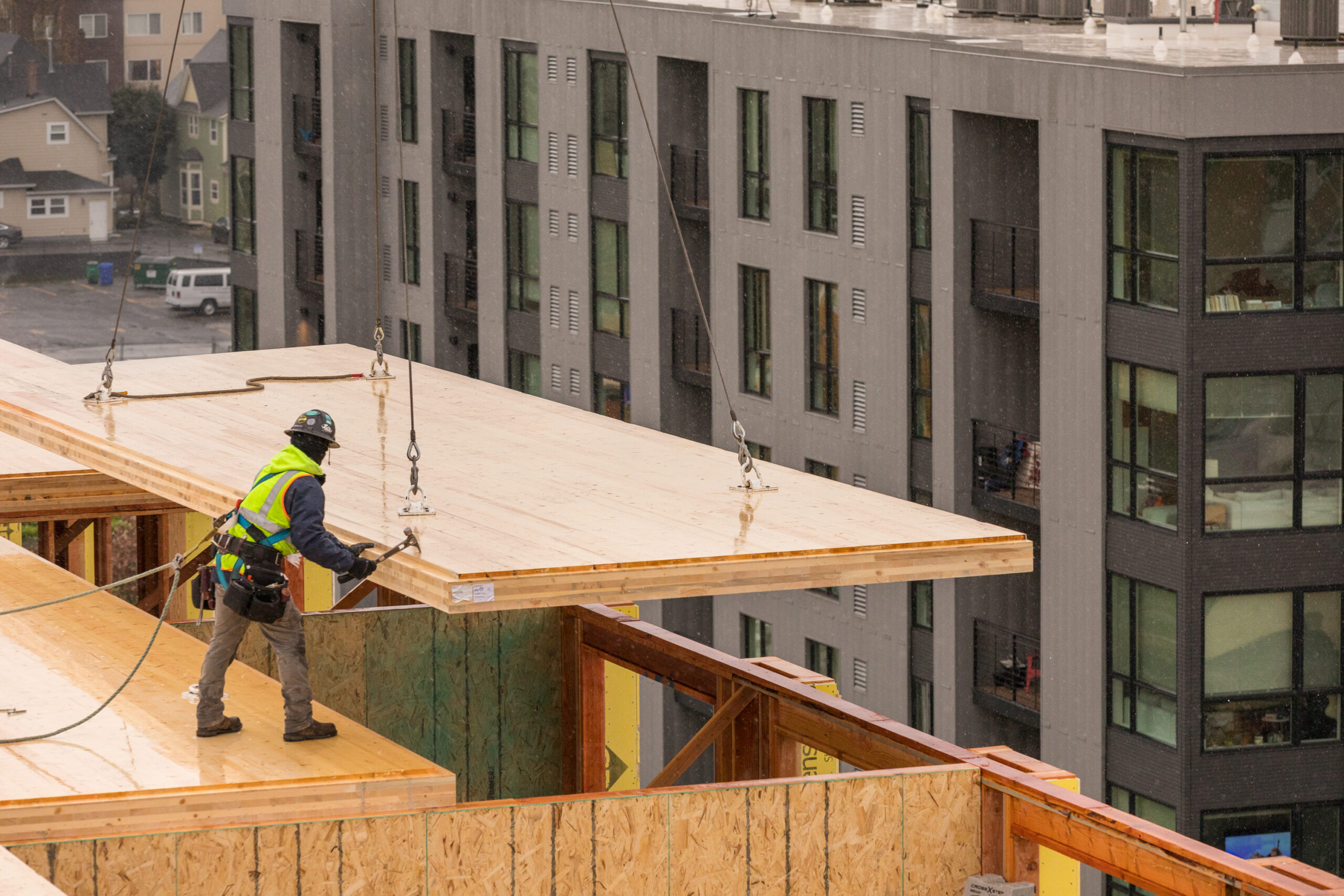 It’s faster: In addition to the positive sustainability and durability elements, building with this product is also beneficial in terms of schedule and budget. In comparison to concrete, building with CLT at The Canyons saved over a week per floor during vertical construction. This faster, more efficient CLT installation process can be seen in the timelapse below. The reduction in schedule also led to cost savings and increased efficiency for subcontracting trades that followed framing.