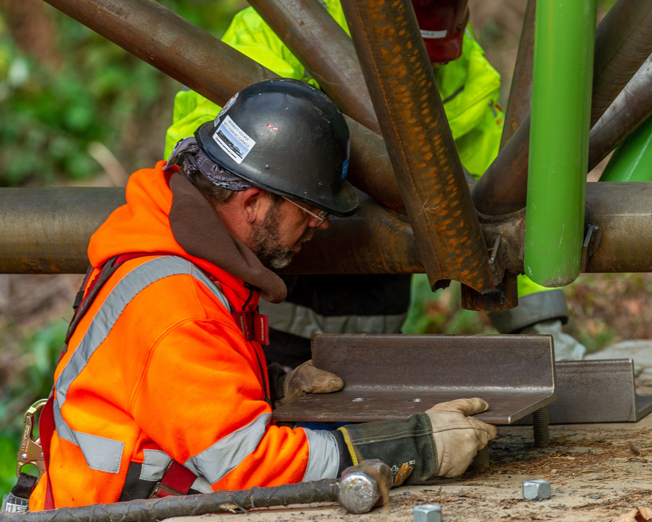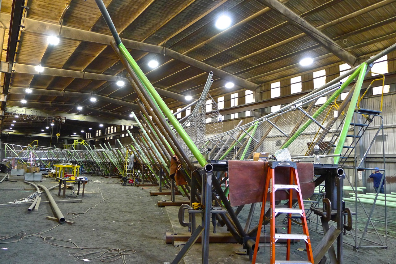 The truss bridge was fabricated by Supreme Steel in their shop in Northeast Portland. Materials incorporated in the construction included galvanized steel, weathering steel, a fiberglass decking system, and a stainless-steel mesh protection barrier that was manufactured in Germany. The entire building team took great pride in crafting the bridge with the highest level of workmanship. During fabrication, careful attention was paid to the quality of each individual weld, which was subject to regular inspection by multiple entities. The engineering and fabrication team utilized Revit extensively to detail and evaluate each of the complicated node connections on the truss. A detailed quality assurance and quality control process was also followed to ensure the painted members of the bridge were coated without flaw to stand the test of time.