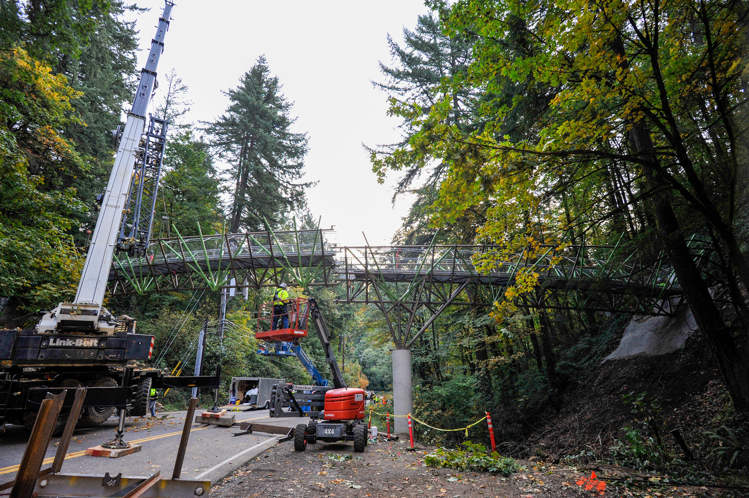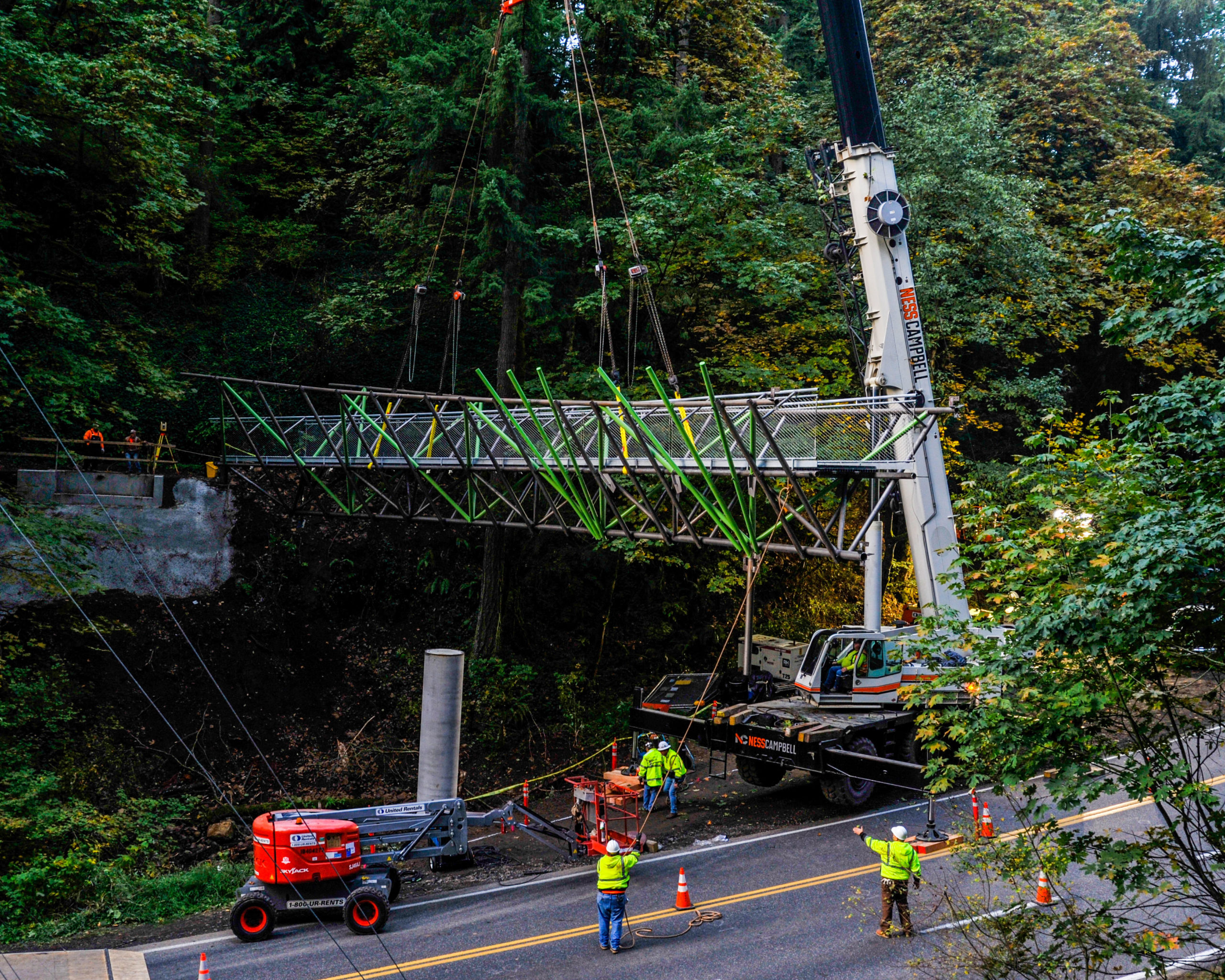 While fabrication was wrapping up at Supreme Steel’s warehouse, work was underway at the site on West Burnside to prepare for the highly complex delivery of the bridge. Concrete abutments were placed on the steep hillside both north and south of Burnside. The south slope’s sharp grade required crews to create a temporary path in order to gain access to drill and install rock anchors. Due to the pristine environment surrounding the site, decommissioning this access path was done with extreme caution in order to preserve the natural setting.