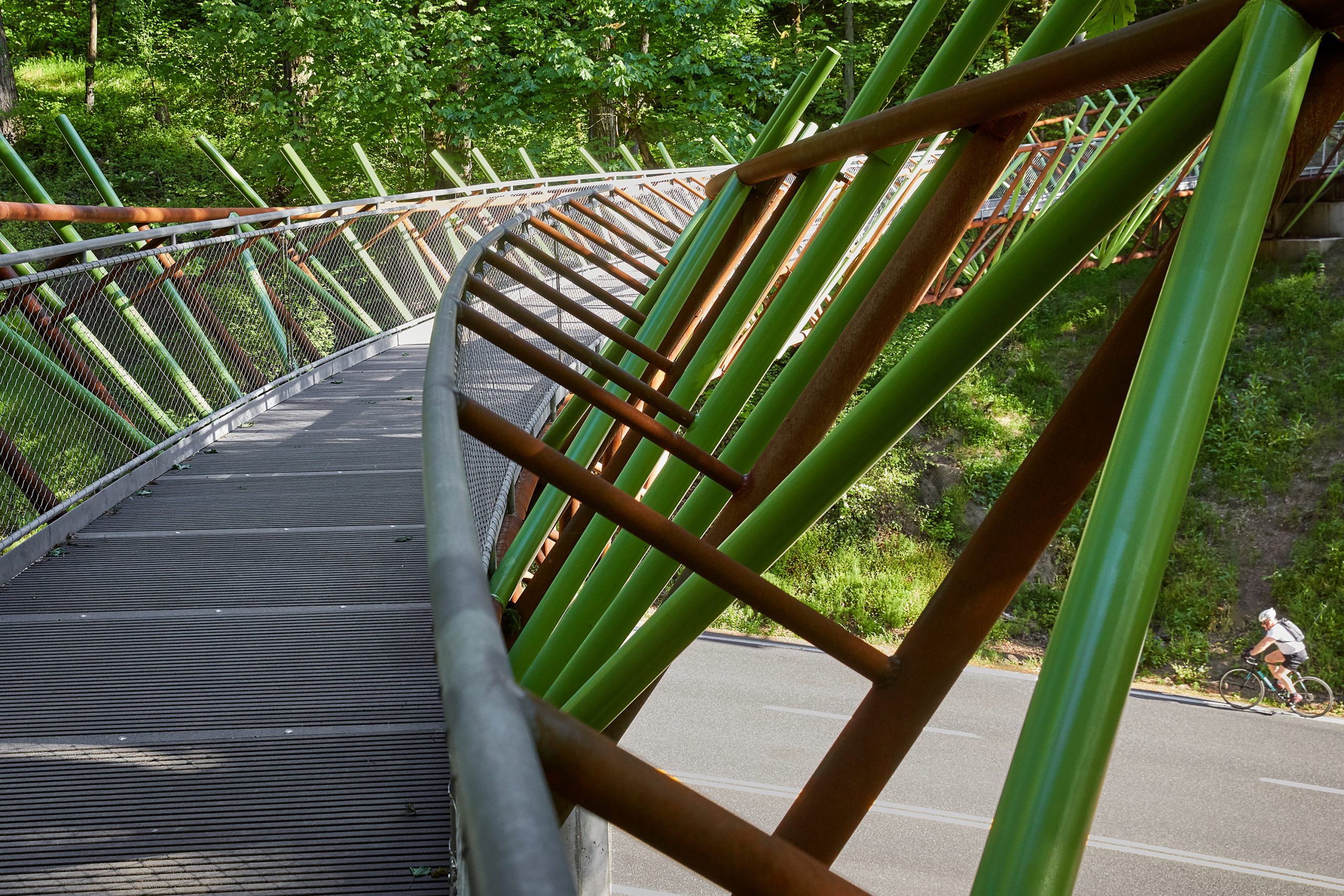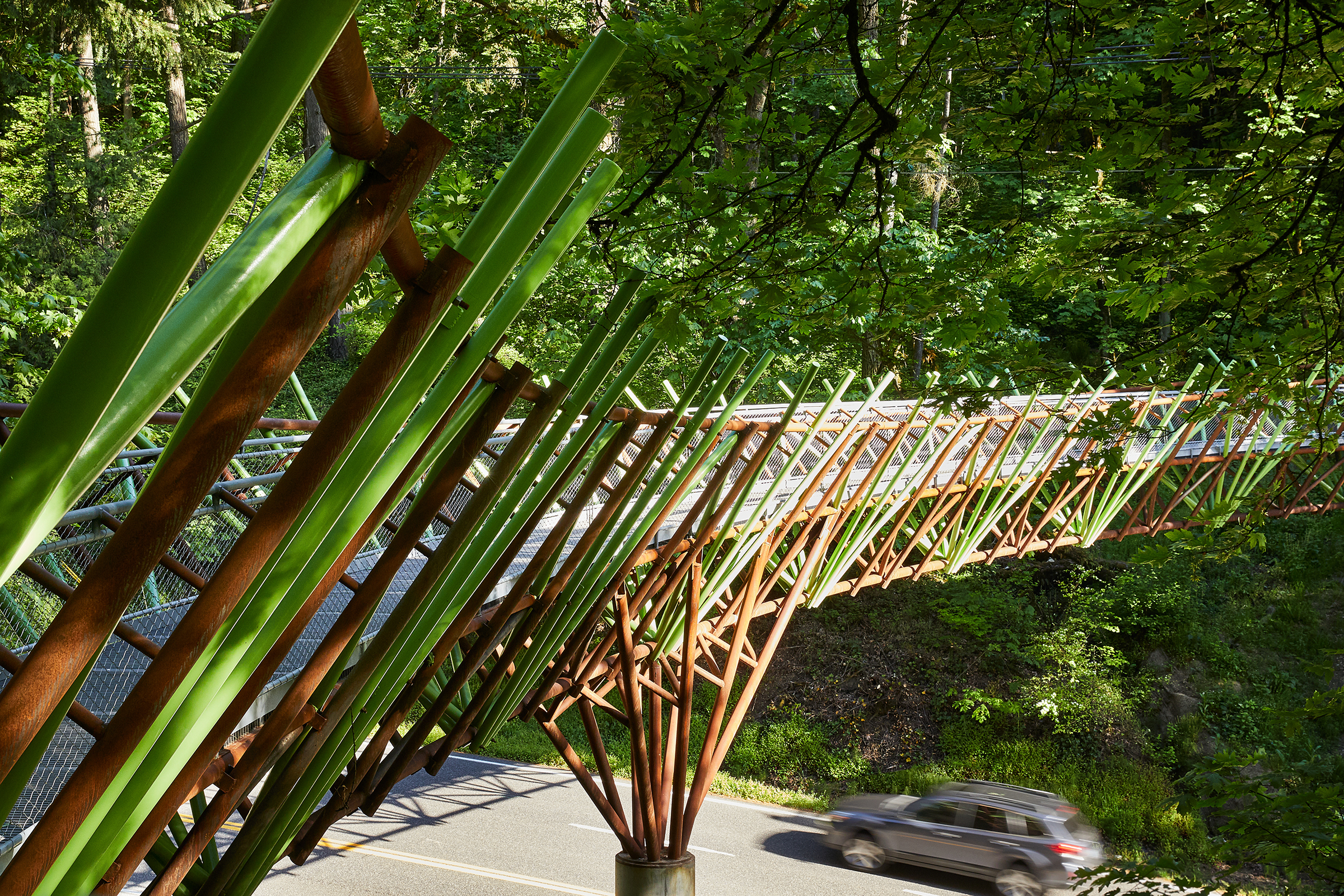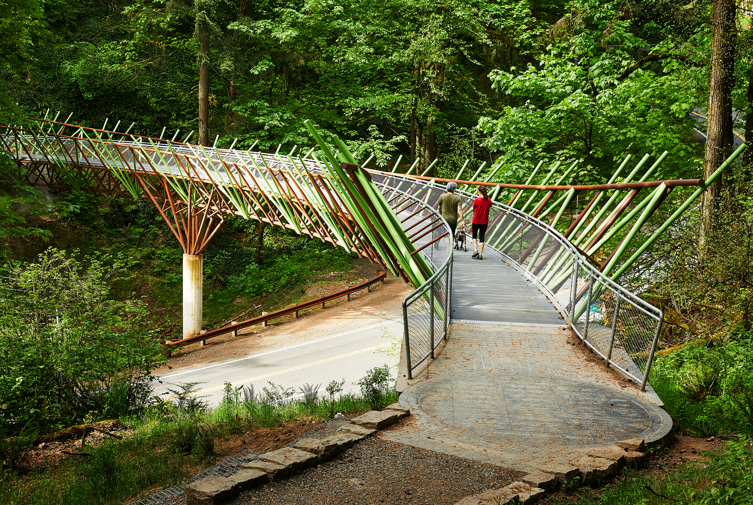 Designed by nationally renowned, Portland-based artist Ed Carpenter, the crossing is intended to blend seamlessly into the natural surroundings. Featuring a walking surface crafted of unique fiberglass panels, the 180-foot bridge curves over Burnside with a 150-foot radius. The sides of the bridge are highlighted by striking green branches that resemble ferns and evergreen needles, and over time the unpainted steel will seal itself with an earthy reddish-brown rust color, further integrating it into its surroundings.